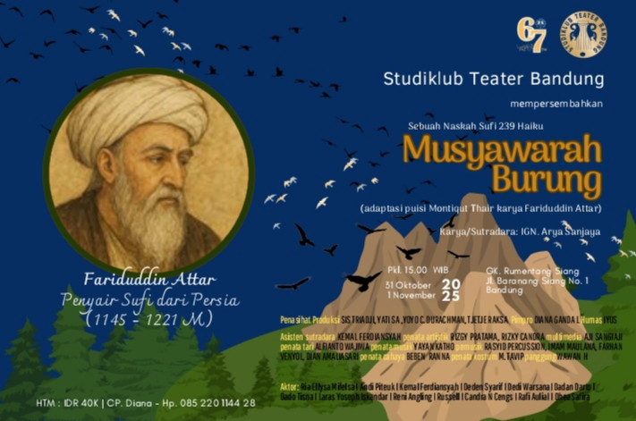 BANDUNG, TINTAHIJAU.com — Menapaki usia 67 tahun, Studiklub Teater Bandung (STB) seolah berhenti sejenak di simpang waktu — merenungi arah perjalanan panjangnya dalam panggung seni. Dari ruang tafakur itulah lahir lakon sufi “Musyawarah Burung”, adaptasi dari mahakarya penyair Persia abad ke-12,  Fariduddin Attar, yang digubah menjadi rangkaian 239 haiku oleh IGN. Arya Sanjaya, sang sutradara.
