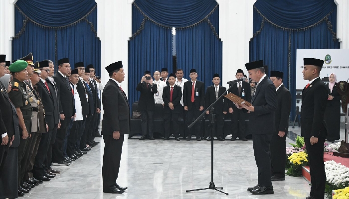 BANDUNG, TINTAHIJAU.com – Penjabat (Pj.) Gubernur Jawa Barat Bey Machmudin mengukuhkan Adi Gemawan sebagai Kepala Perwakilan Badan Pengawasan Keuangan dan Pembangunan (BPKP) Provinsi Jabar di Aula Barat Gedung Sate, Kota Bandung, Senin (6/5/2024).