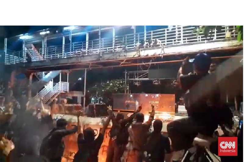 Berdasarkan pantauan di lokasi sekitar pukul 19.00 WIB, setidaknya dua bom molotov dilemparkan oleh massa ke arah barisan polisi. Tidak hanya itu, massa juga menyerang petugas dengan batu dan botol, serta menyalakan kembang api yang diarahkan ke aparat.