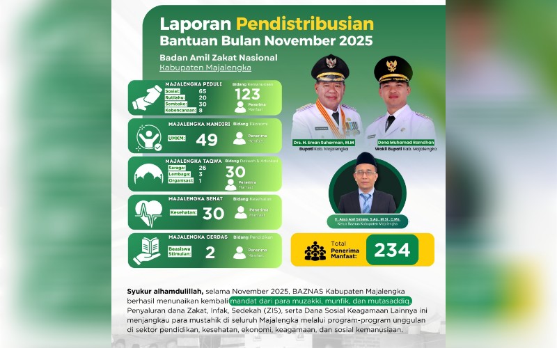 ‎‎Ketua Baznas Majalengka, Agus Asri Sabana, menyampaikan bahwa pendistribusian dana Zakat, Infak, dan Sedekah (ZIS) yang mencapai 234 bantuan pada periode tersebut merupakan bagian dari strategi memperluas dampak sosial secara merata.‎‎