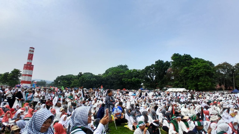 Usai menggelar konvoi, ribuan warga berkumpul di Lapangan Bintang guna penyampaian sikap dari orator, doa dan donasi untuk warga Palestina.