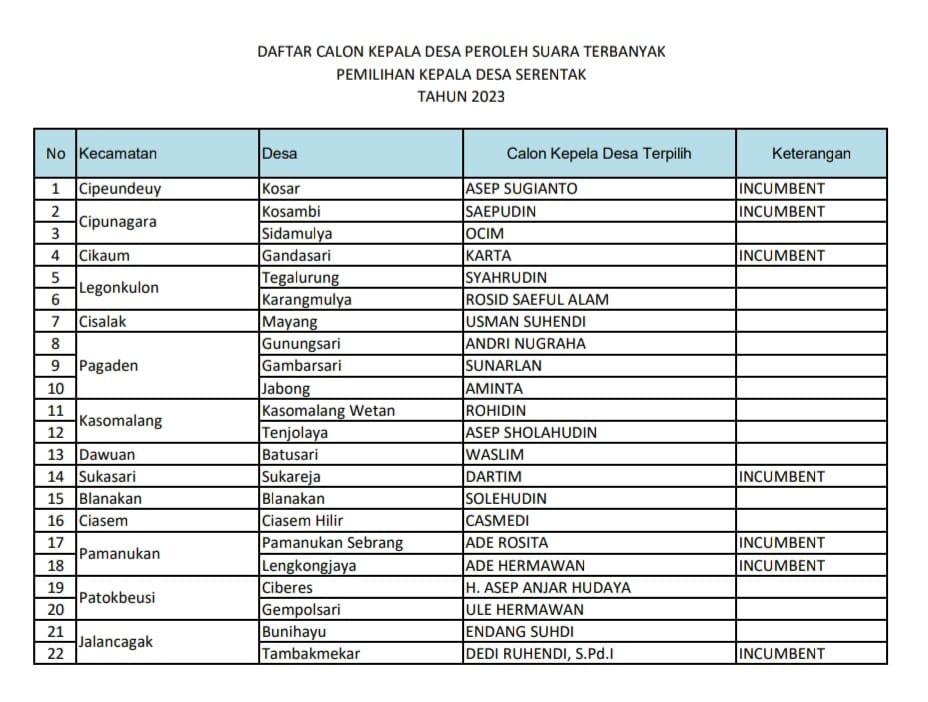Inilah Hasil Pilkades Serentak di Kabupaten Subang, 6 Calon Inkumben Tumbang Halaman 2 MegapolitanInilah Hasil Pilkades Serentak di Kabupaten Subang, 6 Calon Inkumben TumbangRedaksi1 min bacaSenin, 4 Desember 2023×Inilah Hasil Pilkades Serentak di Kabupaten Subang, 6 Calon Inkumben TumbangSebarkan artikel ini Dan berikut daftar calon kades dengan perolehan suara terbanyak: « 1 2