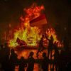 Amarah massa juga meluas ke Gerbang Tol Pejompongan yang dibakar hingga menimbulkan kobaran api besar. Massa bertahan di depan DPR RI sambil melemparkan petasan dan molotov ke arah polisi.