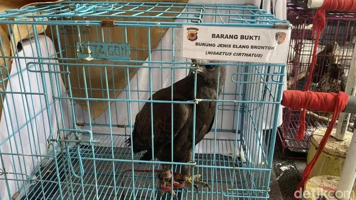 Selain belasan burung elang, polisi turut menyita sejumlah kandang dan bird pavilion yang digunakan untuk memelihara satwa tersebut.