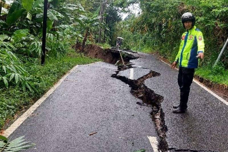 Seorang polisi menunjukkan jalan menuju wilayah Kecamatan Kadupandak, Kabupaten Cianjur, Jawa Barat yang terbelah akibat pergeseran tanah, Kamis (5/12/2024) (Foto: Humas Polsek Kadupandak)