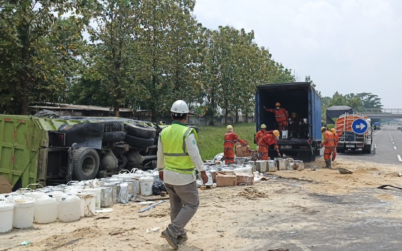 Dari pantauan di lokasi, truk bermuatan pasir tampak terguling di bahu jalan dengan kondisi sebagian muatan pasir tumpah ke aspal. Sementara itu, muatan truk kontainer berupa lem dan bahan kimia dalam wadah kaleng serta ember plastik terlihat berserakan, sehingga membuat petugas harus melakukan pembersihan dan pemindahan satu per satu.