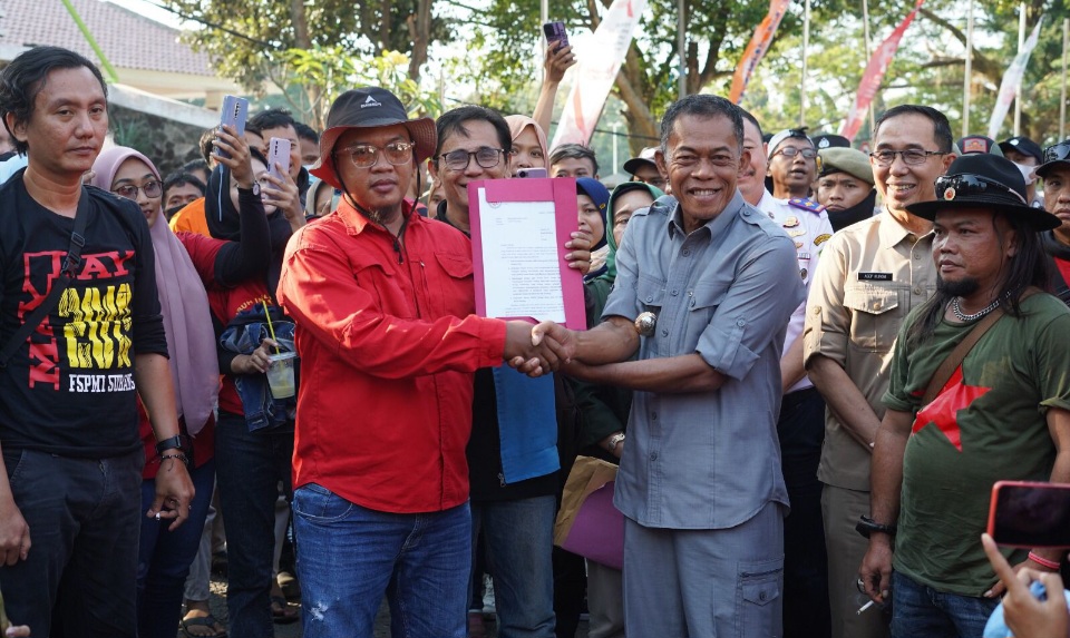 Seusai audiensi, Kang Jimat dan jajaran pun menemui secara langsung para perwakilan buruh yang sedang berdemo di Halaman Kantor Bupati Subang dan menerima dokumen tuntutan aksi dari Aliansi Buruh Subang.