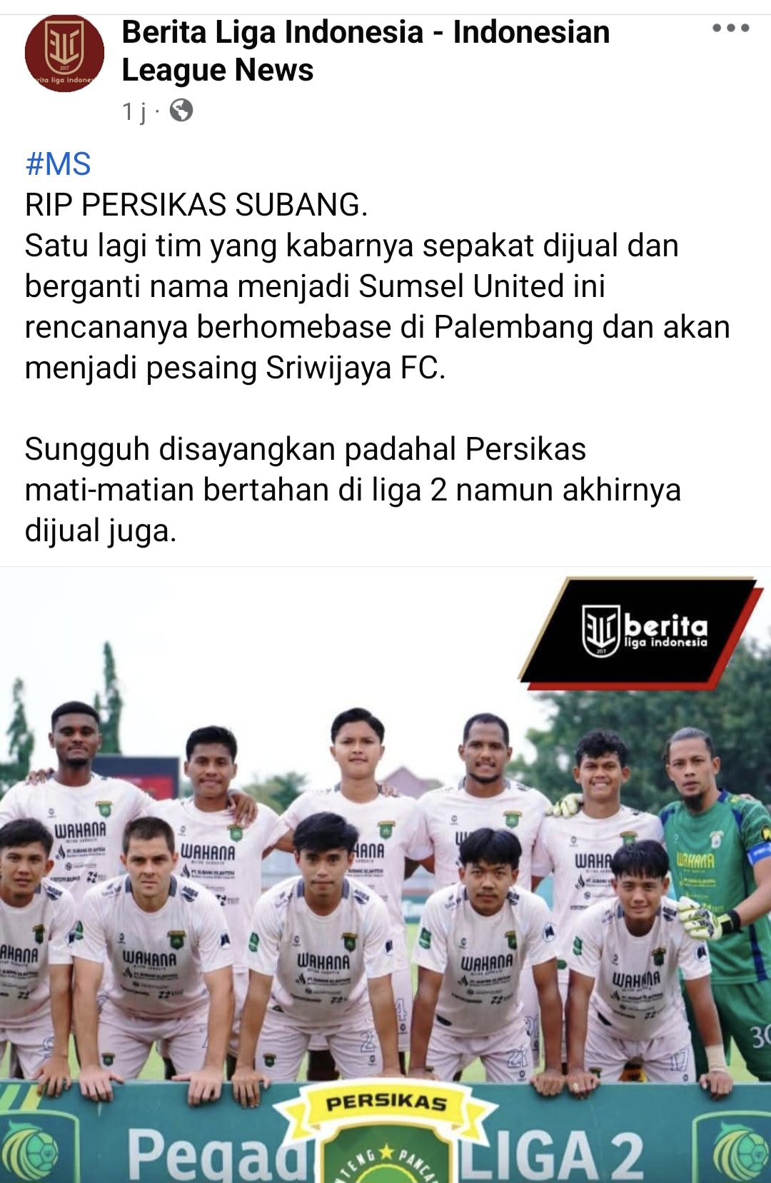 “RIP PERSIKAS SUBANG. Satu lagi tim yang kabarnya akan dijual dan berganti nama menjadi Sumsel United. Akan berhomebase di Palembang dan menjadi pesaing Sriwijaya FC. Sungguh disayangkan, padahal Persikas mati-matian bertahan di Liga 2 namun akhirnya dijual juga.”