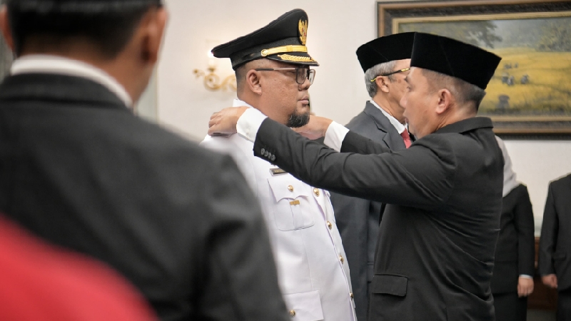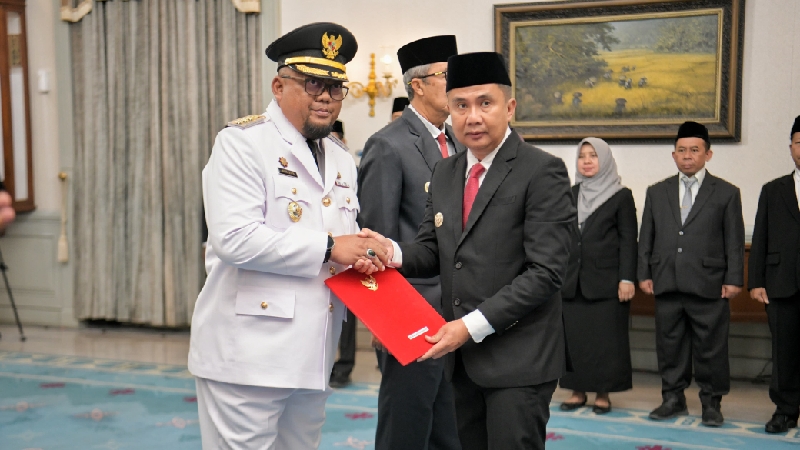 BANDUNG, TINTAHIJAUCOM- Penjabat (Pj.) Gubernur Jawa Barat Bey Machmudin melantik Soni Harison sebagai Pj. Wali Kota Banjar di Gedung Pakuan, Kota Bandung, Rabu (11/12/2024).