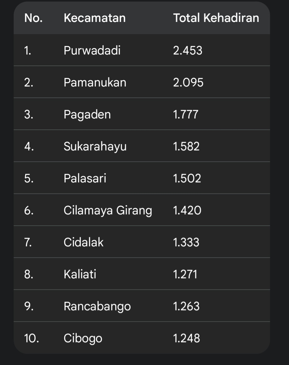 Data ini menunjukkan wilayah Pantura dan Subang bagian tengah mendominasi peringkat teratas. Partisipasi masif dari kecamatan-kecamatan ini menjadi tulang punggung peningkatan cakupan kesehatan di tingkat kabupaten.