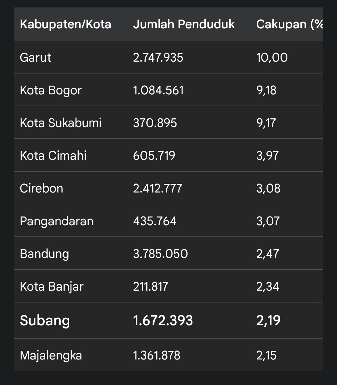 Posisi Subang di peringkat 9 ini berada di tengah persaingan ketat dengan kabupaten/kota lain yang memiliki jumlah penduduk dan cakupan kesehatan yang beragam. Berikut adalah rincian data cakupan 10 besar kabupaten/kota di Jawa Barat, berdasarkan data per Juni 2025: