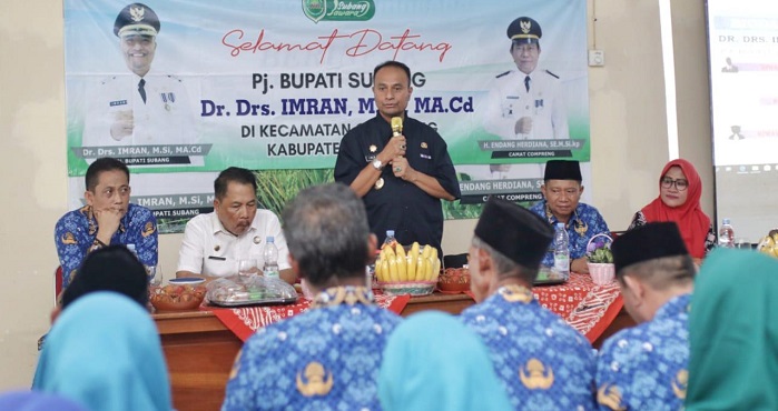 Pj. Bupati Subang Dr. Imran dalam sambutannya menyampaikan bahwa dalam menjalankan tugas, dirinya akan selalu memberikan 1000% kinerjanya untuk tugas yang dirinya emban, termasuk sebagai Pj. Bupati Subang, dirinya berkomitmen untuk membangun Subang dengan maksimal.