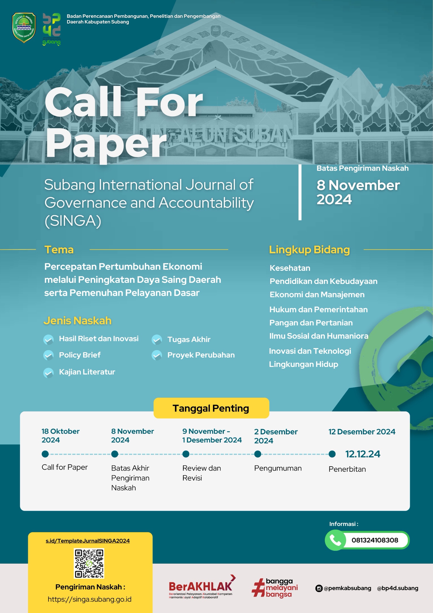SUBANG, TINTAHIJAUcom – Badan Perencanaan Pembangunan, Penelitian dan Pengembangan Daerah (BP4D) Kabupaten Subang kembali mengajak para penulis untuk berkontribusi pada penerbitan Jurnal SINGA Volume 2 Nomor 2, Desember Tahun 2024.