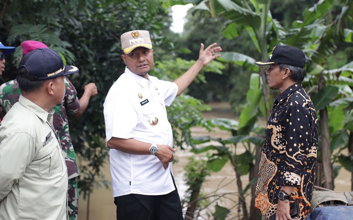 Usai membagikan bantuan pangan, Pj. Bupati Subang meninjau kondisi lokasi banjir di Desa Cilamaya hilir.