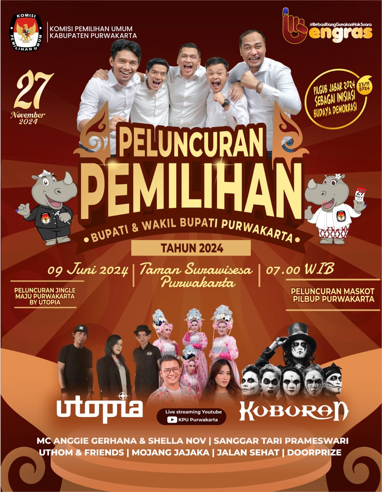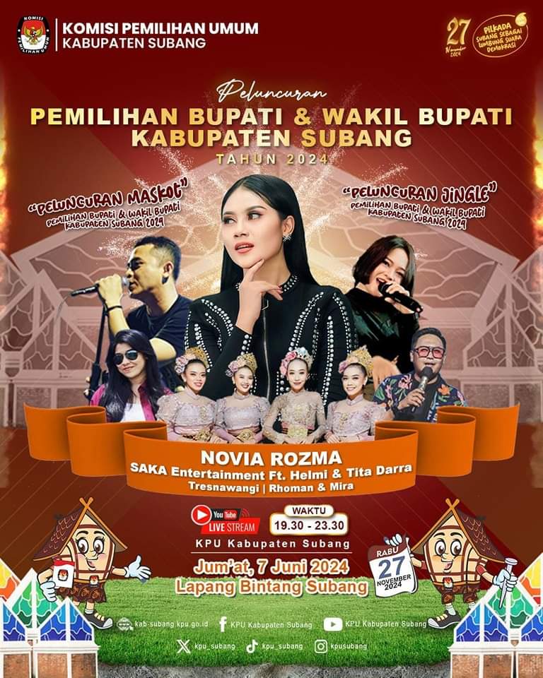 Di Subang, KPU mengundang Jawara D’Koplo Indosiar Novia Rozma, SAKA Entertainment ft Helmi & Tita Darra. Pelaksanaan launching akan digelar di Lapangan Bintang Subang pada Jumat (7/6/2024).