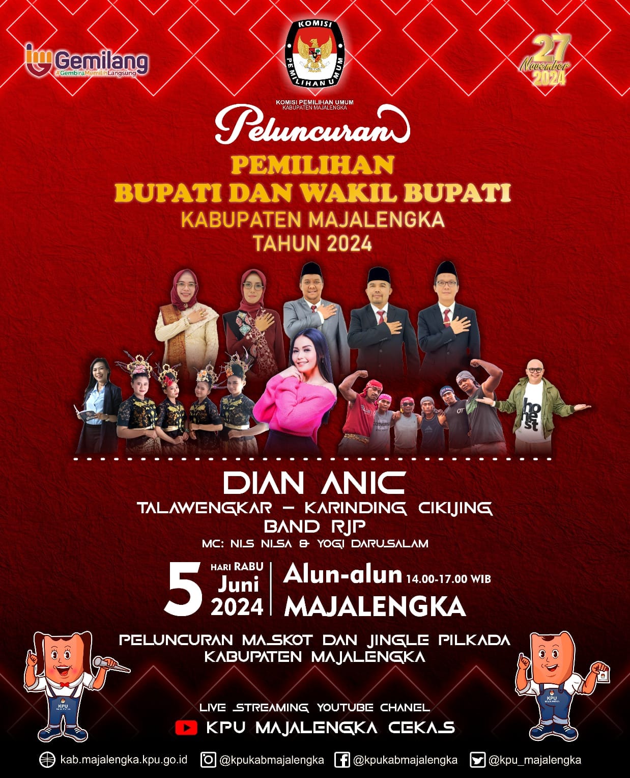 KPU Majalengka, yang menggelar launching Pilkada itudengan menghadirkan Dian Anic. Launching yang digelar di Alun-alun Majalengka pada Rabu (5/6/2024) ini juga menghadirkan Talawengkar, Karinding Cikijing, BAND RIP dan lainnya.