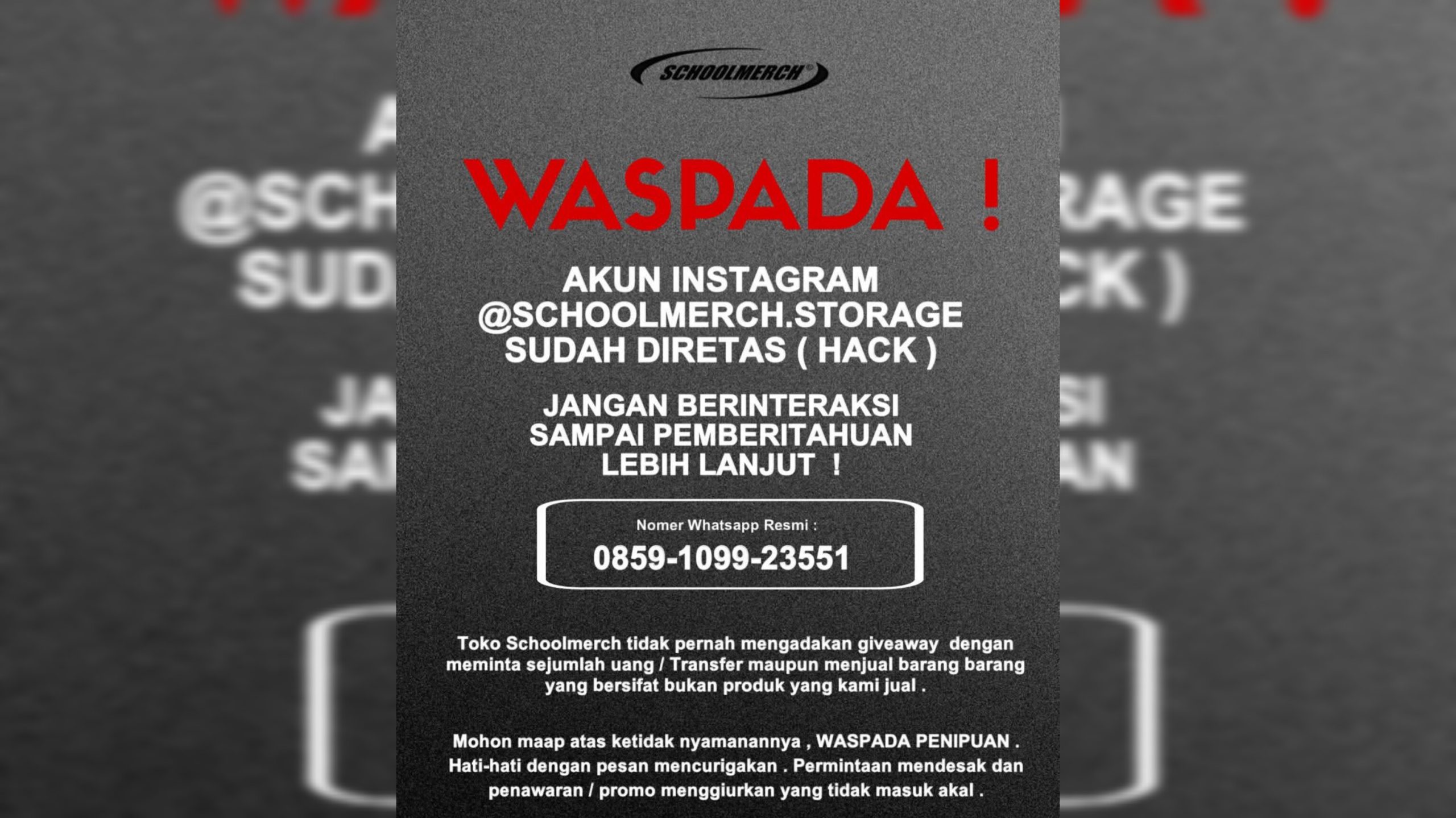 Manajemen Schoolmerch mengajak seluruh pelanggan dan pengikutnya untuk bersama-sama meningkatkan kewaspadaan agar tidak menjadi korban penipuan.