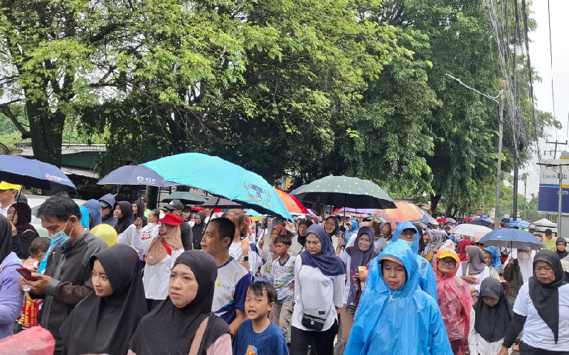 Di belakang rombongan marching band, ribuan peserta tampak memadati ruas jalan dengan mengenakan kaus putih seragam acara. Sebagian besar membawa payung warna-warni, sementara lainnya mengenakan jas hujan untuk melindungi diri dari cuaca.