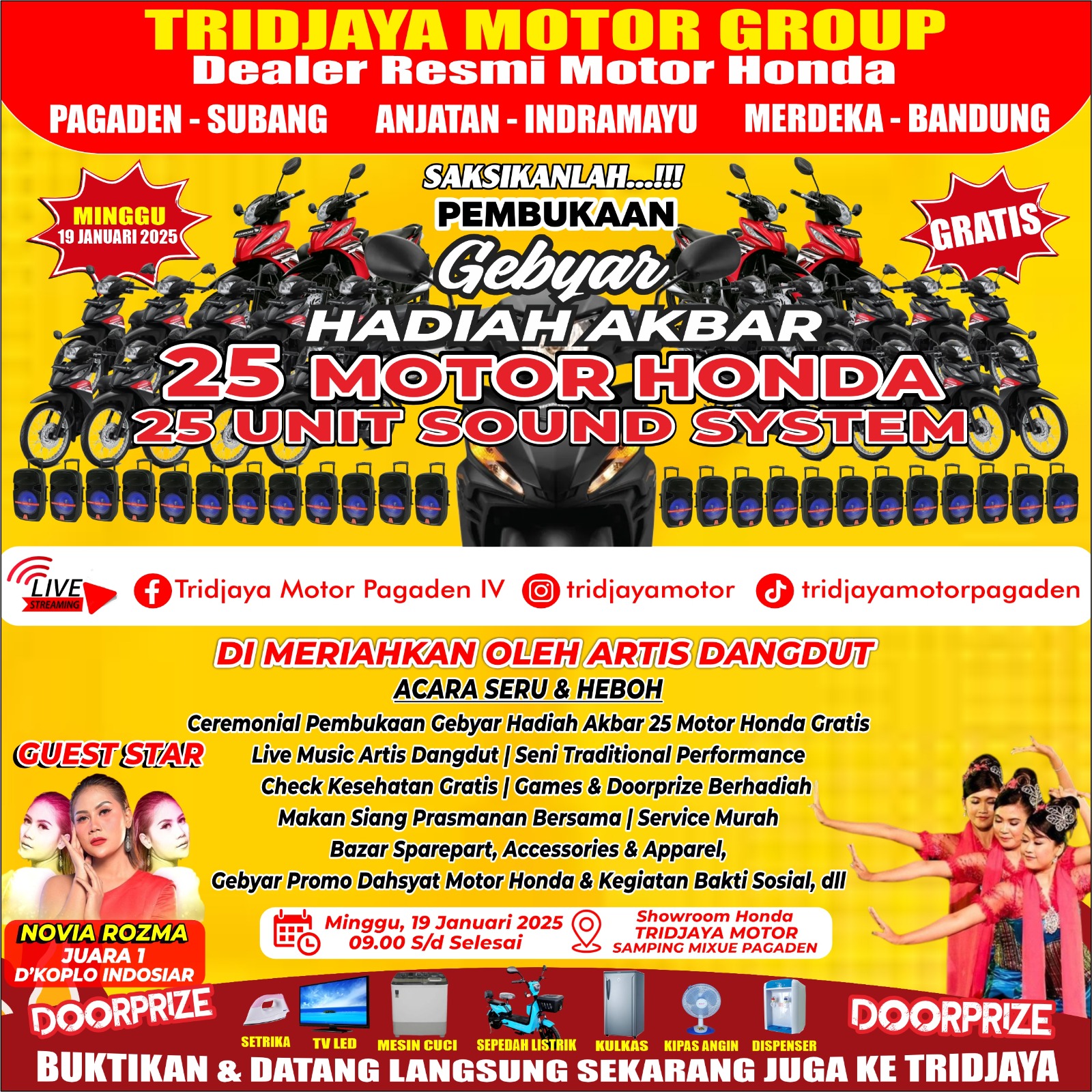 SUBANG, TINTAHIJAUCOM- Dealer Resmi Motor Honda, Tridjaya Pagaden kembali menggelar Gebyar Undian Akbar pada 19 Januari 2025 mendatang.