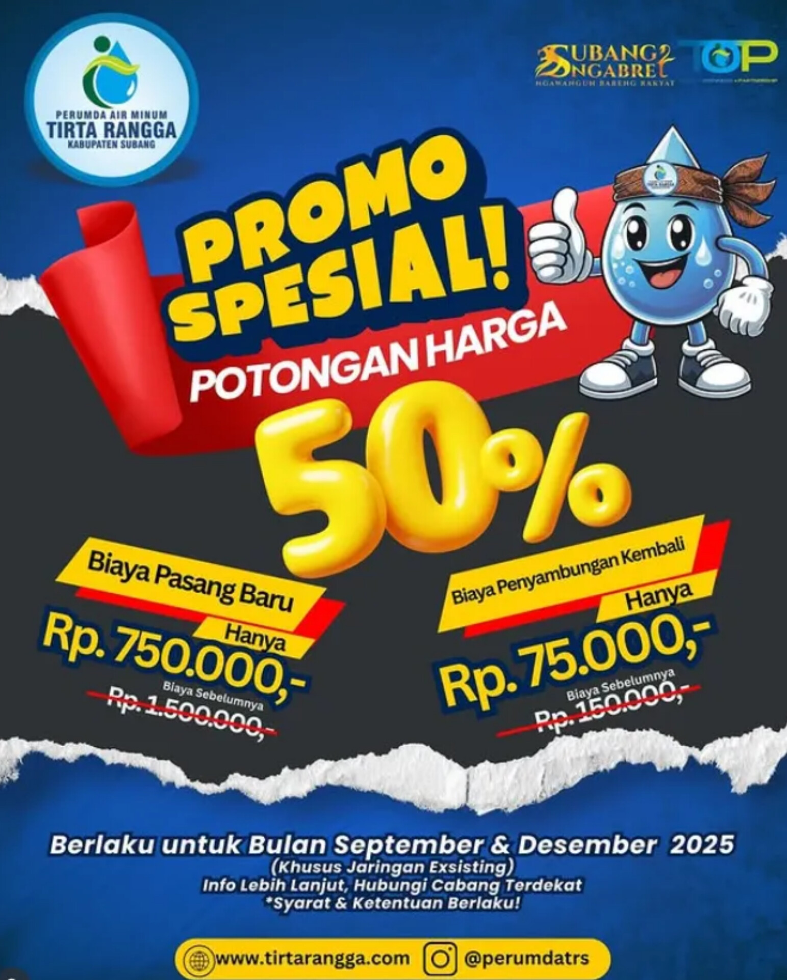Melalui promo ini, biaya pasang baru yang biasanya Rp1.500.000 kini hanya Rp750.000, sedangkan biaya penyambungan kembali turun dari Rp150.000 menjadi Rp75.000. Program ini berlaku khusus untuk jaringan existing dan hanya dibuka pada bulan September dan Desember 2025.