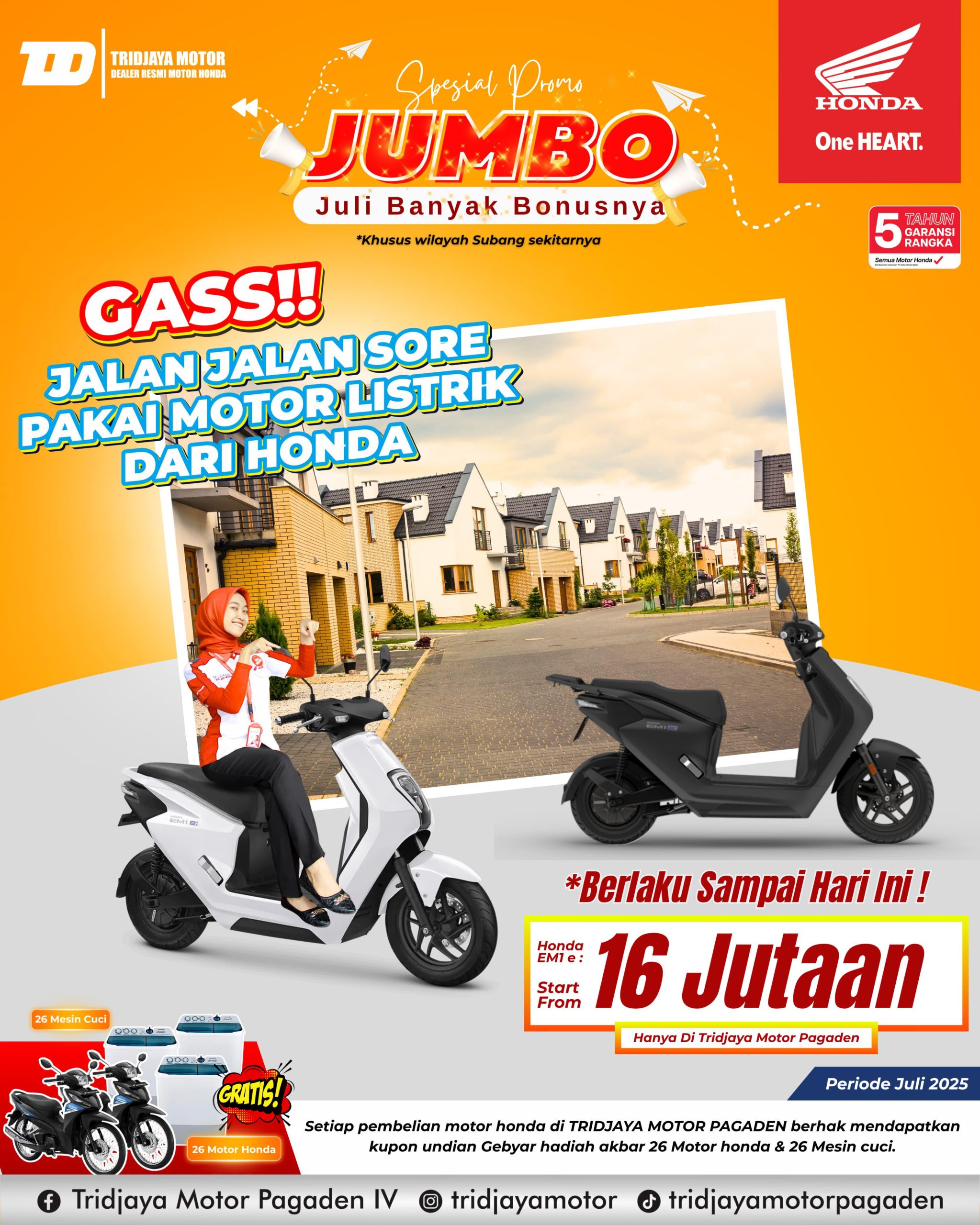 SUBANG, TINTAHIJAU.COM – Kabar gembira buat warga Subang dan sekitarnya! Di bulan Juli ini, Tridjaya Motor Pagaden menghadirkan promo spesial jumbo untuk motor listrik terbaru dari Honda, yaitu Honda EM1 e:. Dalam program ini, skuter listrik ramah lingkungan ini bisa dimiliki mulai dari harga Rp16 jutaan saja!