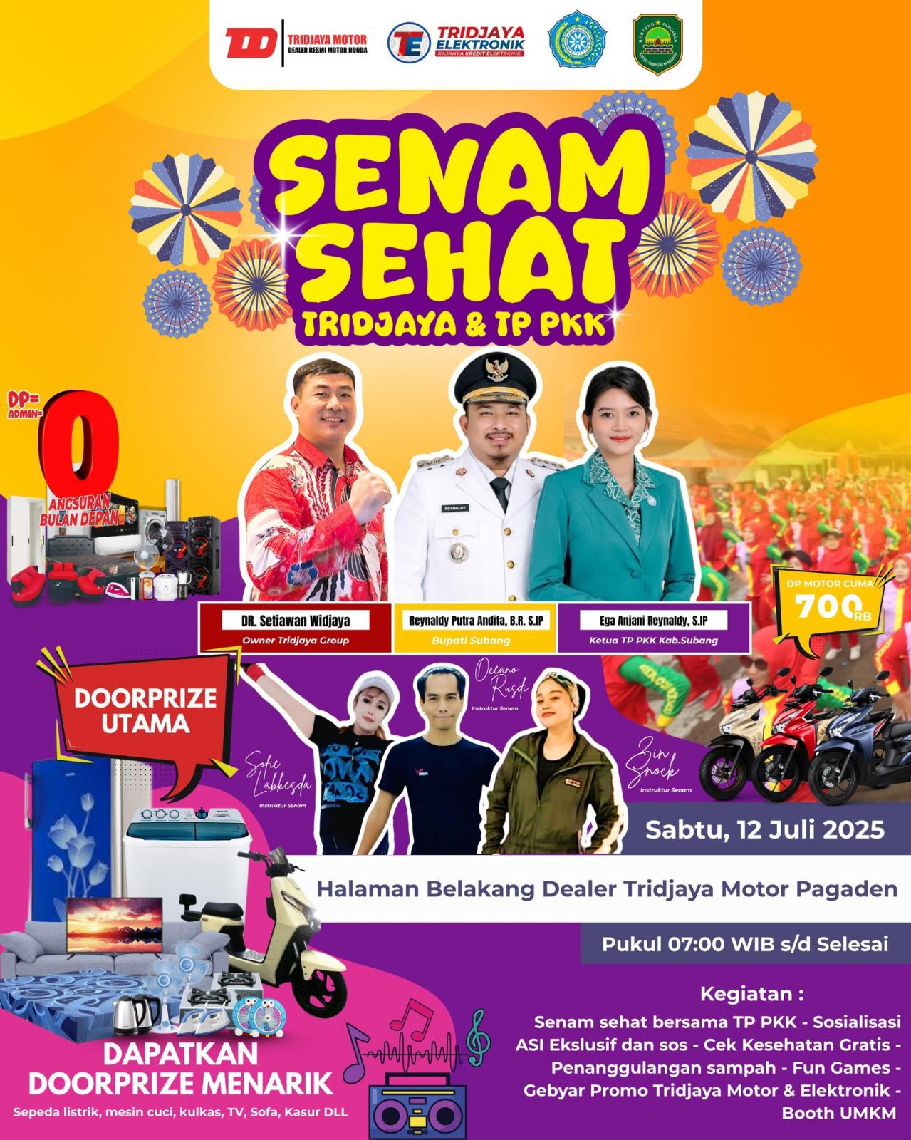 SUBANG, TINTAHIJAU.COM – Semangat hidup sehat dan penuh hadiah akan mewarnai akhir pekan warga Subang! Tridjaya Motor bekerja sama dengan TP PKK Kabupaten Subang akan menggelar acara Senam Sehat yang terbuka untuk umum pada Sabtu, 12 Juli 2025 di halaman belakang Dealer Tridjaya Motor Pagaden, mulai pukul 07.00 WIB hingga selesai.