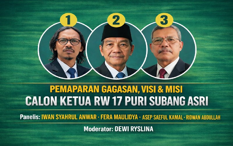 Debat yang dikemas dalam forum NgaRUJAK (Ngariung Rapat Umum Janji Kerakyat) ini akan digelar pada Rabu malam, 14 Januari 2026, pukul 20.00 WIB, di Sekretariat Pemilihan RW 17, Masjid Darul Amanah, Komplek Puri Subang Asri.