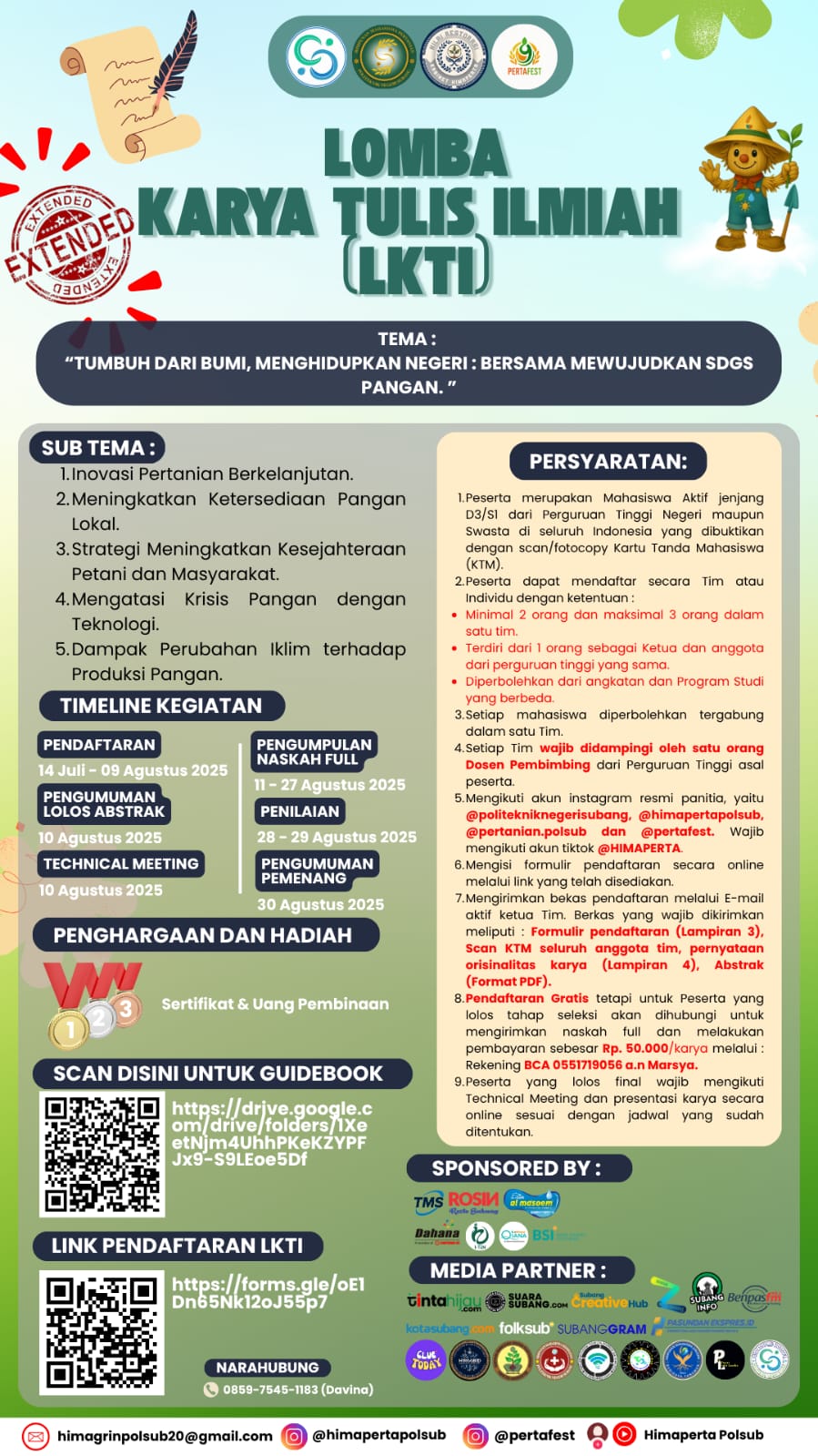 “Selain menjadi wadah inovasi dan pemikiran kritis mahasiswa, LKTI ini juga diharapkan mampu memberikan kontribusi nyata bagi sektor pertanian dan pangan berkelanjutan di Indonesia,” ujar panitia PERTAFEST 2025.
