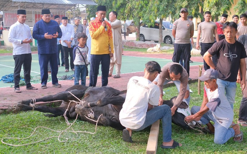 Pada tahun ini, Polres Subang menyembelih total 20 ekor hewan kurban yang terdiri dari 10 ekor sapi dan 10 ekor domba, Jumat (6/6/2025).
