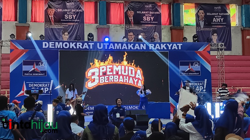 SUBANG, TINTAHIJAU.COM- Band dari Jabatan, Tiga Pemuda Berbahaya turut memeriahkan kunjungan Ketua Majelis Tinggi Partai Demokrat, Susilo Bambang Yudhoyono (SBY) dan Ketua Umum Partai Dempkrat, Agus Harimurti Yudhoyono (AHY) Kabupaten Subang.