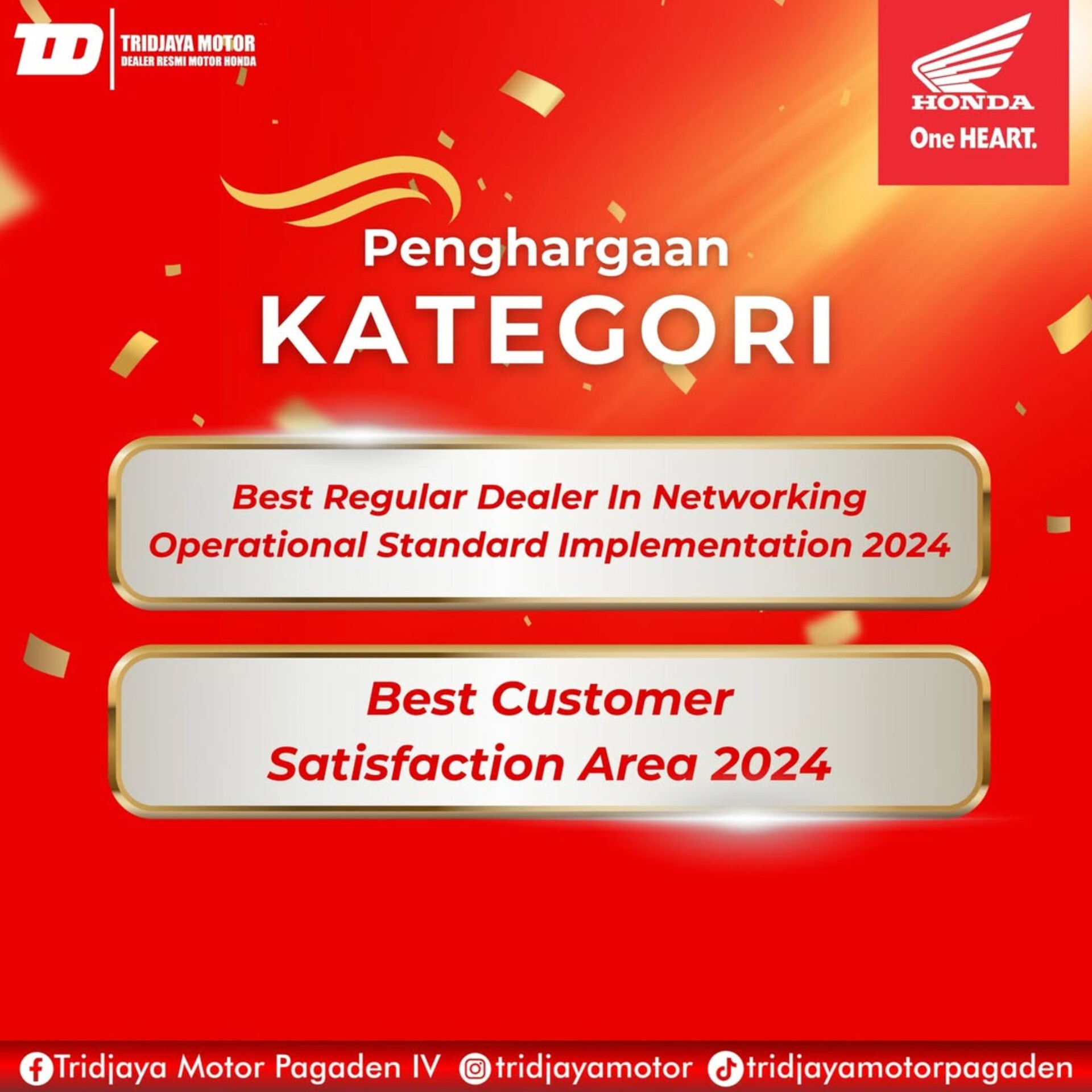 Pada momen bergengsi itu, Dealer Tridjaya Motor Pagaden menjadi salah satu DEALER TERBAIK se-Jawa Barat untuk kategori Best Reguler Dealer in NOS 2024 dan Best Customer satisfaction Area 2024.