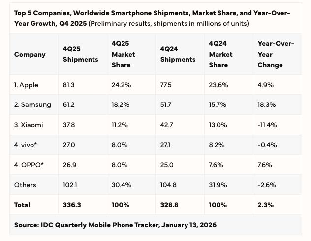 Sementara itu, Samsung mencatatkan pertumbuhan kuartalan terkuatnya sejak 2013 dengan kenaikan 18,3 persen pada Q4 2025. Secara tahunan, raksasa teknologi asal Korea Selatan itu tumbuh 7,9 persen, ditopang kinerja ponsel lipat Galaxy Z Fold 7 serta penetrasi Galaxy A-Series yang kini telah dibekali teknologi kecerdasan buatan (AI).