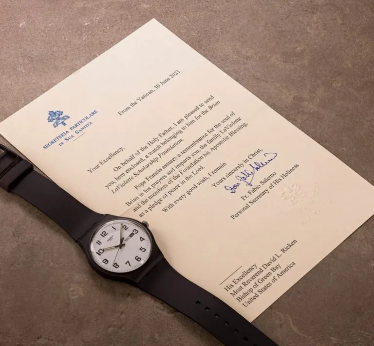 Pada tahun 2022, Swatch SR1130SW-GB743 milik Paus Fransiskus pernah dilelang untuk tujuan amal. Jam tangan tersebut terjual dengan harga fantastis, yaitu US$100.000 (sekitar Rp1,5 miliar), dalam acara yang diadakan oleh Brian LaViolette Scholarship Foundation di Amerika Serikat. Dana hasil lelang tersebut digunakan untuk beasiswa, sebuah tindakan yang kembali mencerminkan kepedulian Paus terhadap sesama.