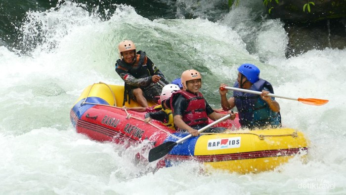 Wisatawan terlihat antusiasme saat menyusuri jalur arung jeram Sungai Palayangan. Aktivitas tersebut berlangsung dengan pengamanan standar, termasuk penggunaan perlengkapan keselamatan selama pengarungan.